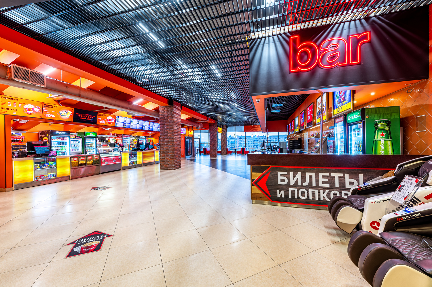 Кинотеатр находится в одном здании со станцией метро Международная