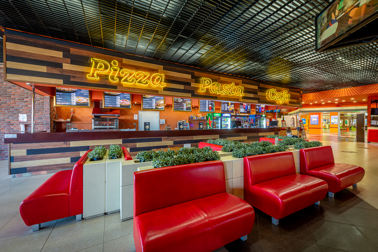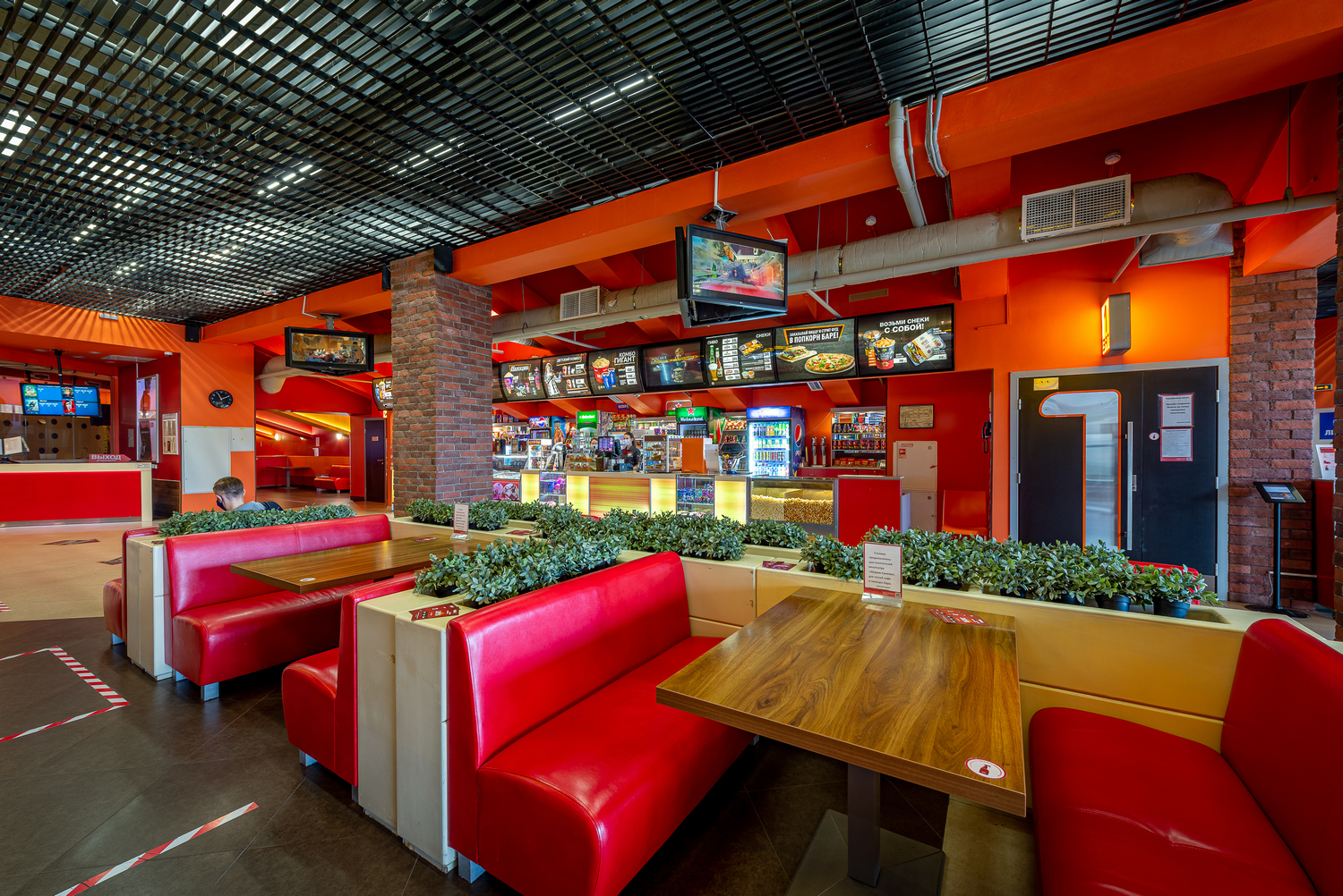 Плазменные панели с трансляций расписания, трейлеров фильмов, меню бара и акций