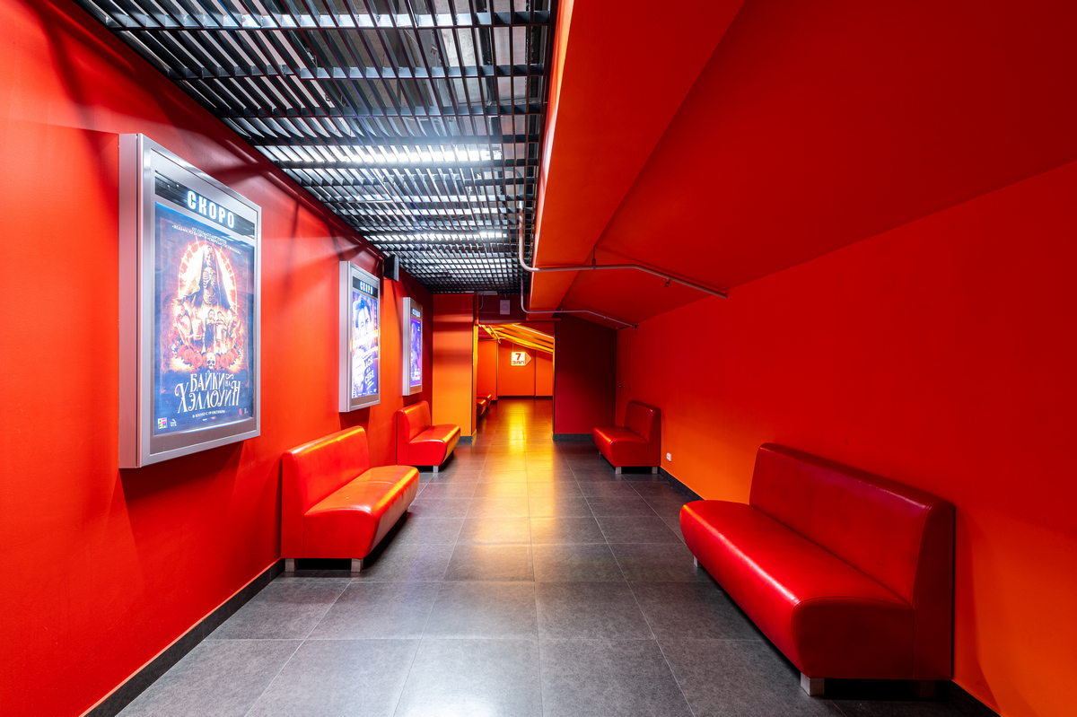 В кинозалах черные стены с красной подсветкой создают завораживающую мистическую атмосферу